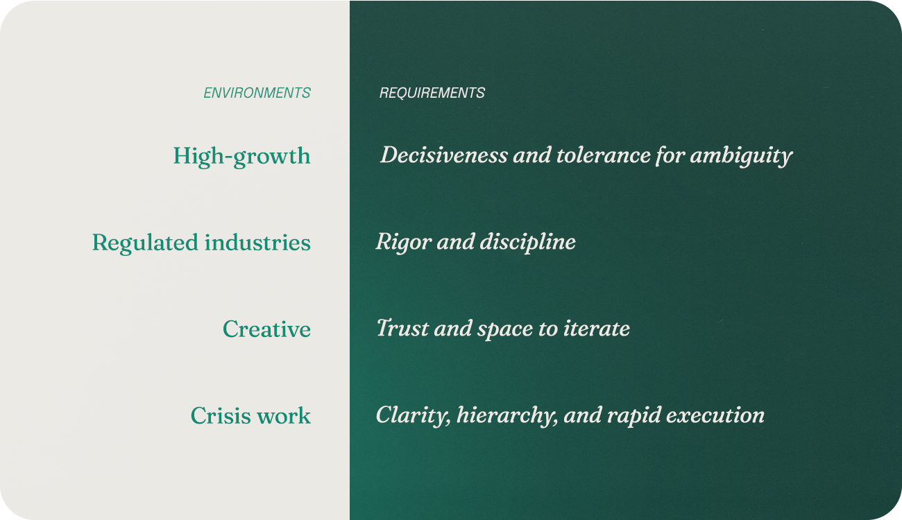 High-growth environments require decisiveness and tolerance for ambiguity. Regulated industries require rigor and discipline. Creative work needs trust and space to iterate. Crisis work demands clarity, hierarchy, and rapid execution.