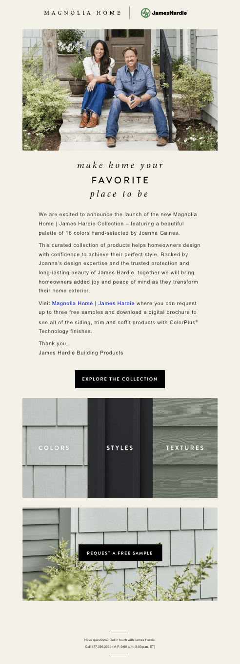 - Deploy announcement email: Promote the launch of the Magnolia Home | James Hardie Collection to the database.