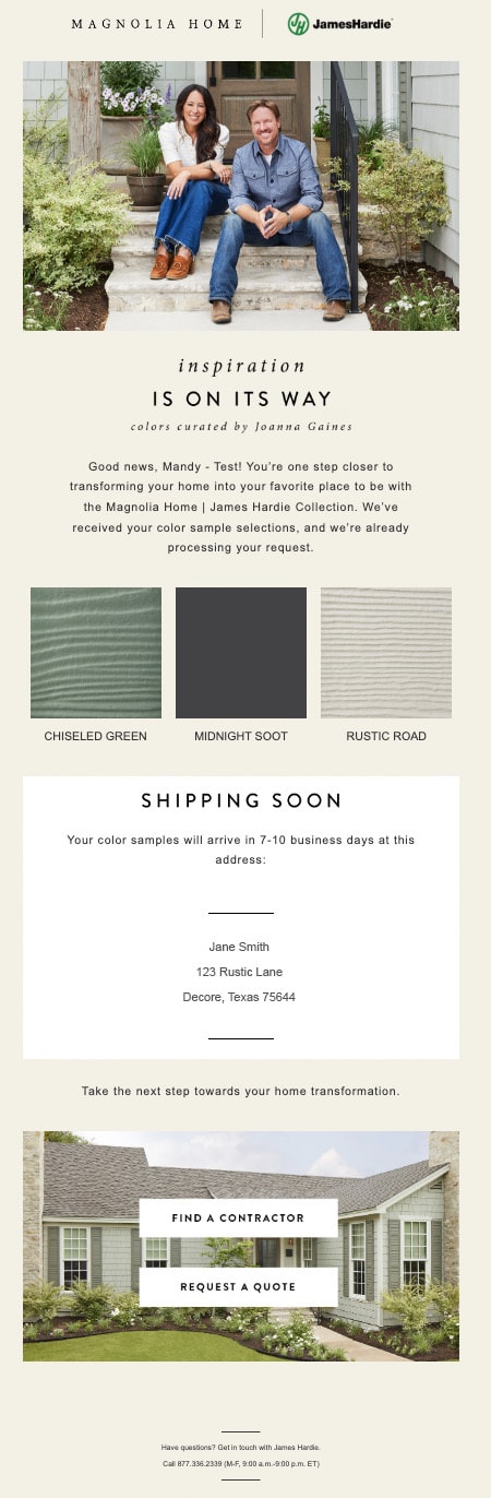 When a user filled out the Sample Request form, they had the option to choose from a wide range of siding samples. Upon launch, we added the Magnolia Home | James Hardie Collection to the sample request form. This process also involved setting up velocity scripting in Marketo to capture customers' sample order details along with their email address and integrating the new, hardcoded emails into the existing sample request program. Finally, we created a new drip program specific to the Magnolia Home | James Hardie Collection sample selections.
