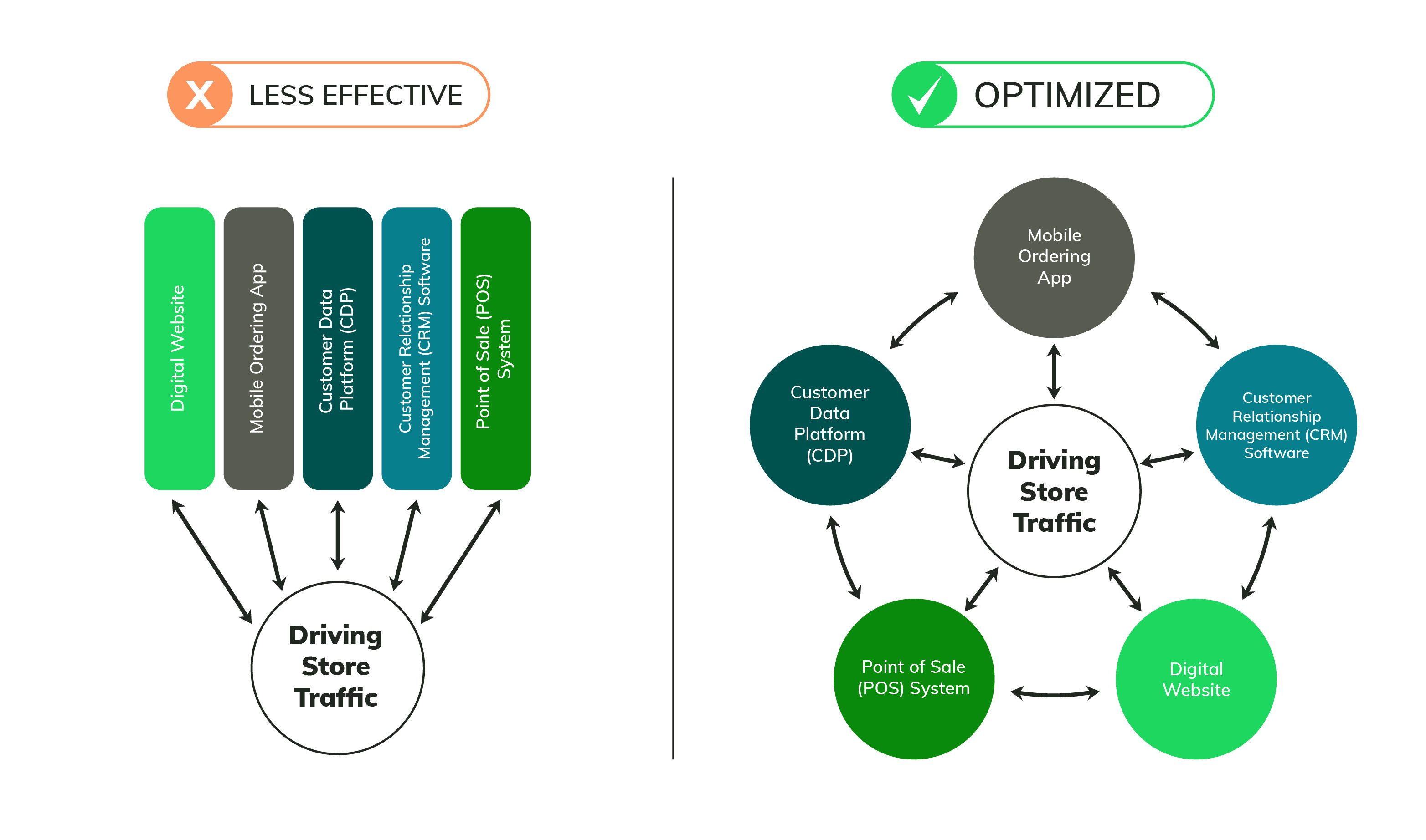 To move from a siloed ecosystem to one that is connected and unified, QSR brands should aim to adopt a “hub and spoke” model.