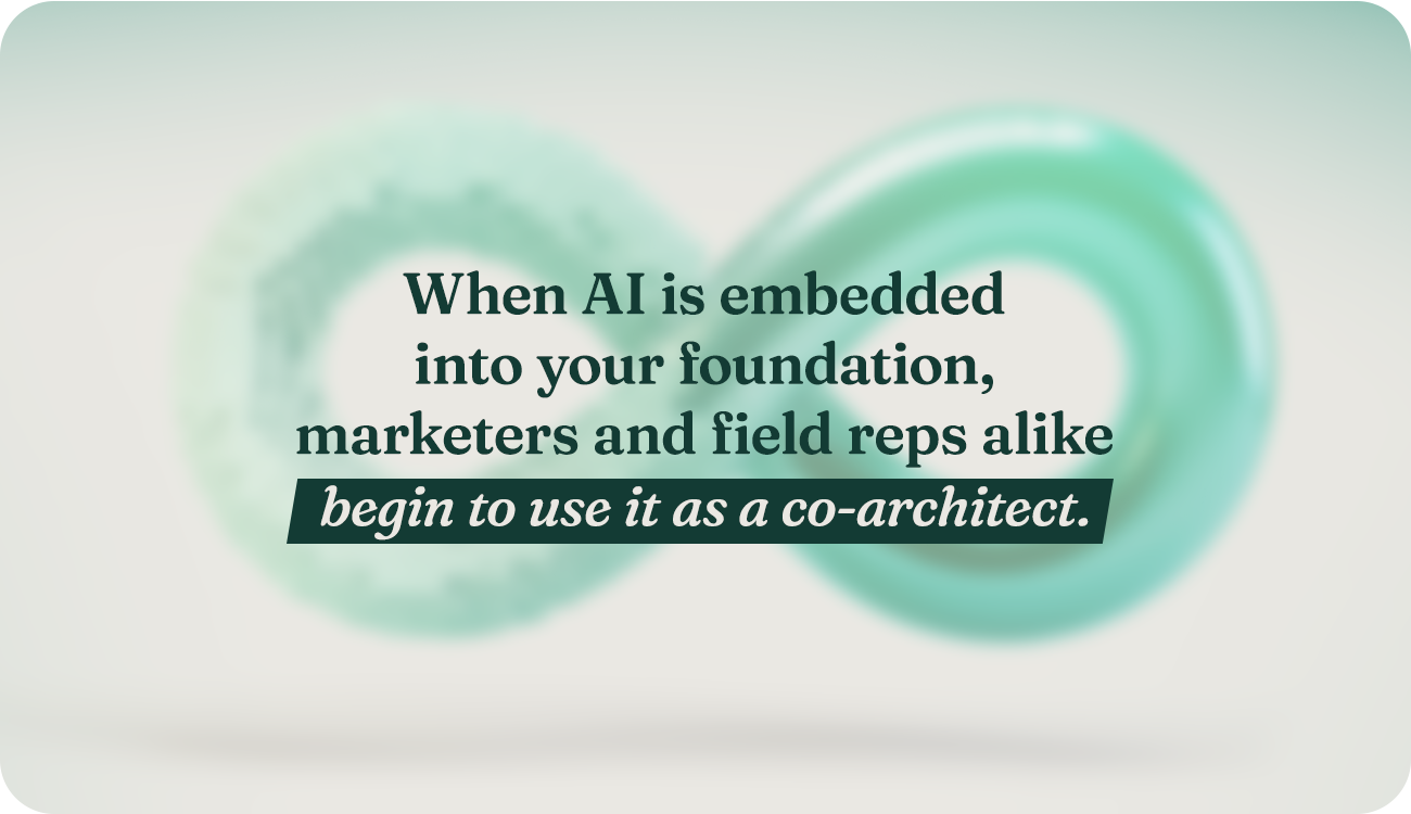 Here’s where AI can handle the repetitive, patterned tasks. When AI is embedded into your foundation, marketers and field reps alike begin to use it as a co-architect, a valuable team member.