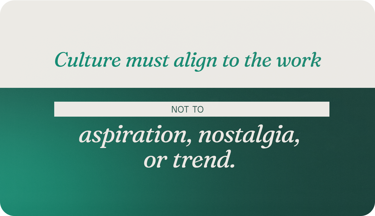Then we blame people when execution breaks down. Culture must align to the work not to aspiration, nostalgia, or trend.